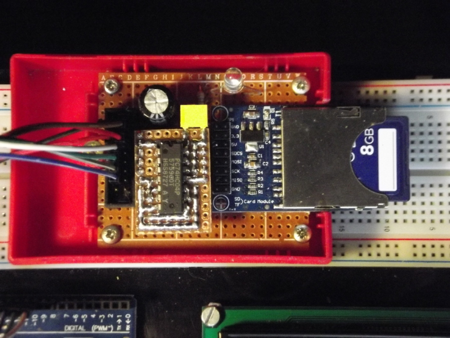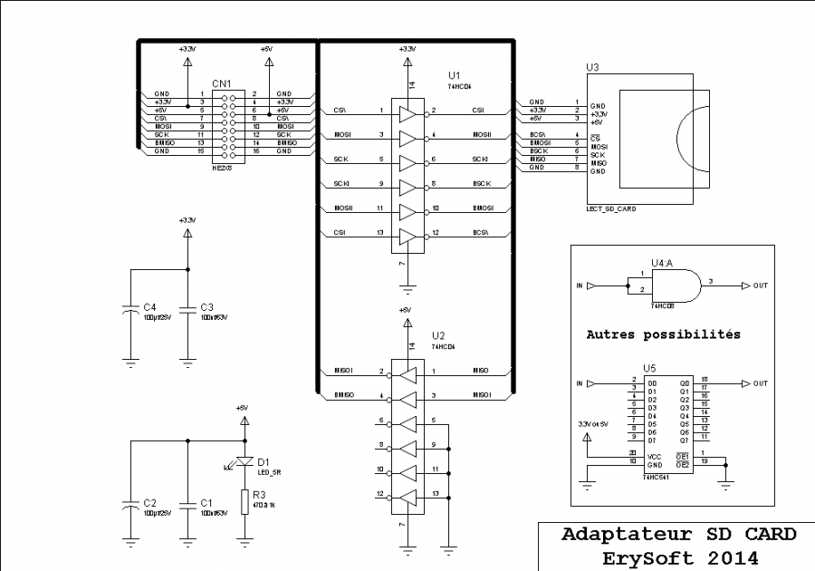 Bien qu'ayant un stock de pièces détachées digne d'un magasin de distribution, je n'ai trouvé que des 74HC04 et des 74HC541. Par manque de place sur le prototype, j'ai dû bricoler une carte "casse-dalle" (sandwitch) pour les amoureux et nostalgiques de la langue Française. On peut utiliser aussi des 74HC08. Pour les signaux CS, MOSI et SCK, le CI est alimenté en +5V. Pour le signal MOSI, l'autre CI est alimenté en 3,3V, tension disponible sur la carte support de la SD CARD.
