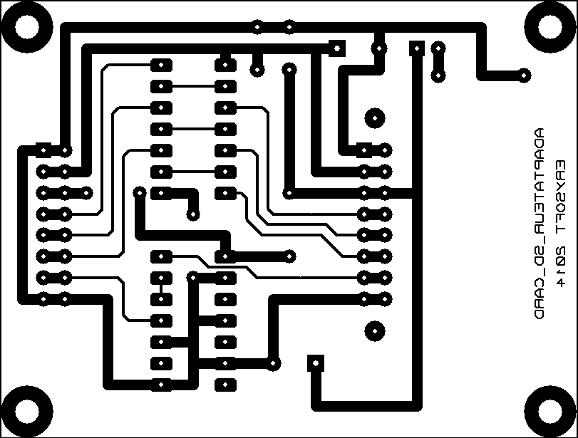 N'oubliez pas de souder les 3 straps avant de câbler les composants. Pour ce qui est de la SD CARD, il est nécessaire de faire passer les plots du connecteur côté soudure. Pour cela, utilisez un support en bois adéquat (Planche de 10 mm), et tout en maintenant la panne de votre fer sur un des plots, appuyez doucement jusqu'à arriver au ras du plastique. Eviter de dessouder le connecteur, au risque d'arracher un trou métallisé. Pour maintenir la carte en place, utilisez du ruban adhésif double face de 2 mm d'épaisseur environ.