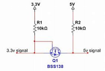L'avantage de ce montage est qu'il est bidirectionnel. Vous pouvez donc transformer un signal 5V en 3,3V, et de 3,3V en 5V. Le BSS138 est un CMS. Vous pouvez le remplacer par un BS170 en boîtier TO92.
